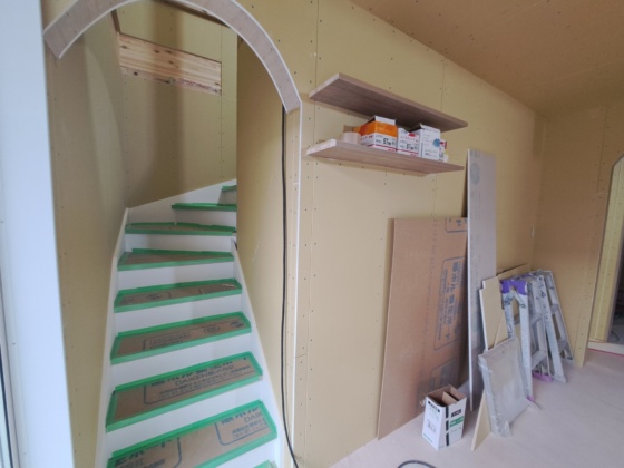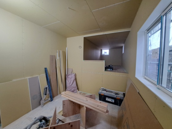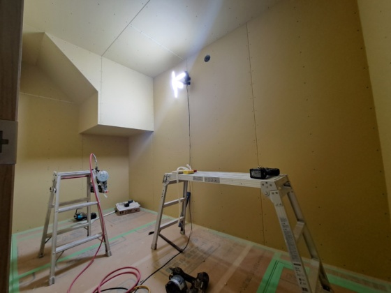 室内では、壁・天井ともに石膏ボードの施工がほぼ完了しました。