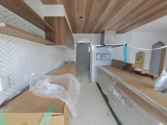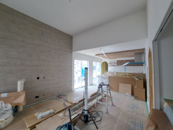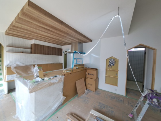 LDKではキッチンや収納、下がり天井などの造作が整い、空間の広がりや動線がはっきりしてきました。