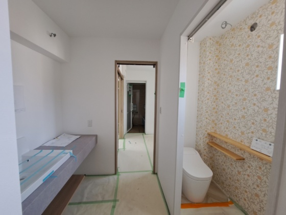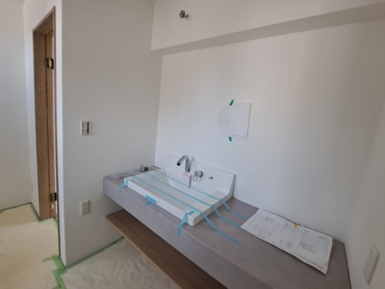 洗面スペースでは、カウンターや洗面ボウルが設置され、使い勝手や高さなども確認できる状態です。