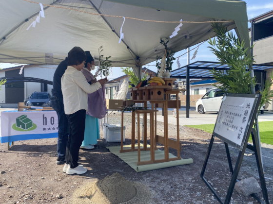 神主様をお招きし、祝詞奏上により工事の安全とご家族の繁栄を祈願。