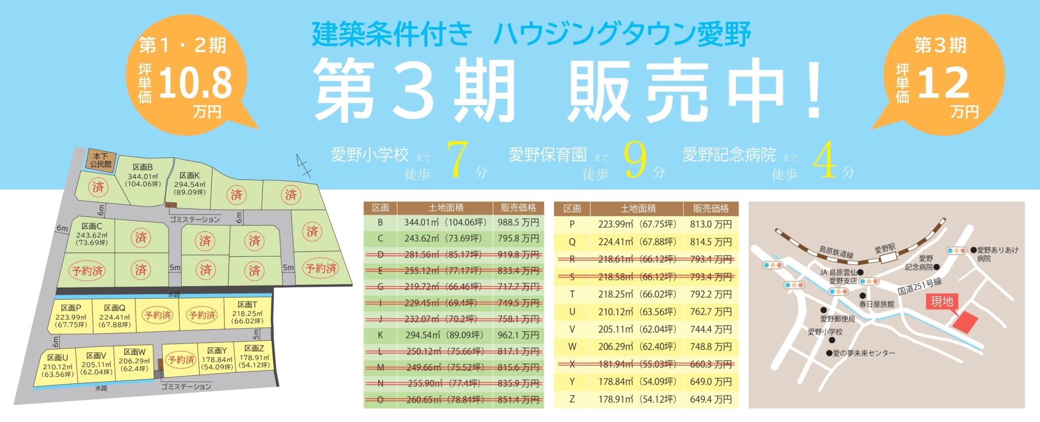 | 物件概要 | 【第1・2期】 B:344.01㎡(104.06坪)/988.5万円 C:243.62㎡(73.69坪)/795.8万円 K:294.54㎡(89.09坪)/962.1万円 【第3期】 P:223.99㎡(67.75坪)/813.0万円 Q:224.41㎡(67.88坪)/814.5万円 T:218.25㎡(66.02坪)/792.2万円 U:210.12㎡(63.56坪)/762.7万円 V:205.11㎡(62.04坪)/744.4万円 W:206.29㎡(62.40坪)/748.8万円 Y:178.84㎡(54.09坪)/649.0万円 Z:178.91㎡(54.12坪)/649.4万円 ーーーーーーーーーーーーーーーーーーーーーーーーーー 【所在地】雲仙市愛野町甲3735-1他 【交 通】愛野駅 徒歩6分/愛野駅前バス停 徒歩5分 【地 目】宅地 【都市計画】都市計画区域外 【用途地域】無指定 【引渡し条件】建築条件付き※1 【引渡し日】即時 【設 備】上水宅内引込予定(水道加入金44,000円) 浄化槽設置義務あり(雲仙市より浄化槽設置補助金制度あり) ※1 この土地は、土地売買契約締結後3ヶ月以内に、㈱ハウジングと建物の建築請負契約を締結することを条件に販売致します。この期間内に建築請負契約が締結されなかった場合は、土地売買契約は白紙となり受領した手付金等の金銭はお返しいたします。 |