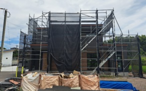 上棟から7週間が経った愛野町O様邸の様子です。 外壁には透湿防水シートの上からサイディング(外装材)が取り付けられています。 玄関には靴箱が設置されま…