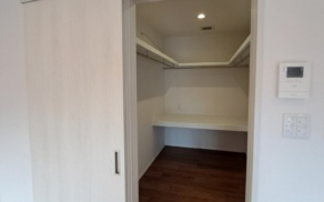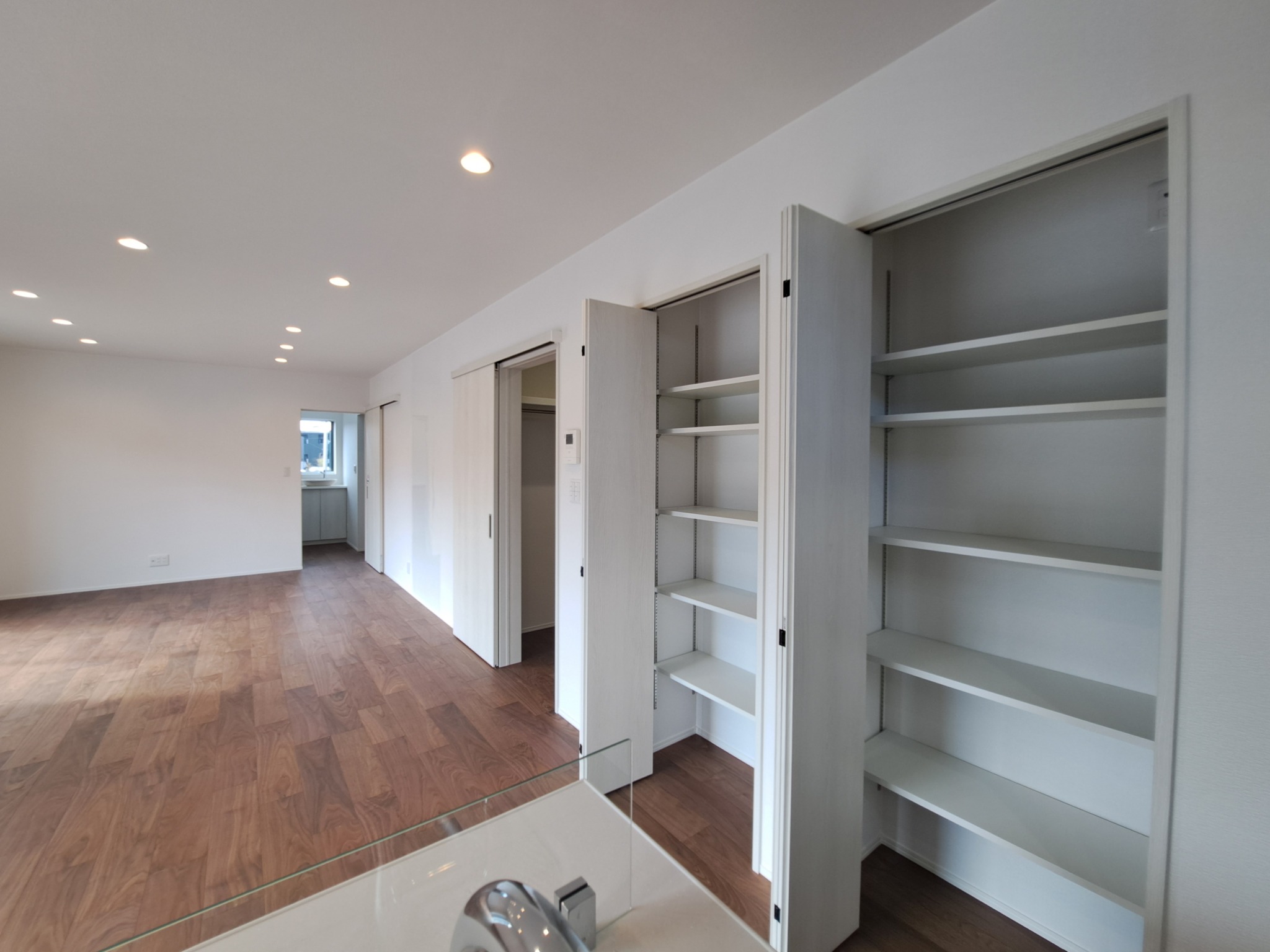 背面収納もたっぷり付いて、奥にはパントリーと勝手口があります。