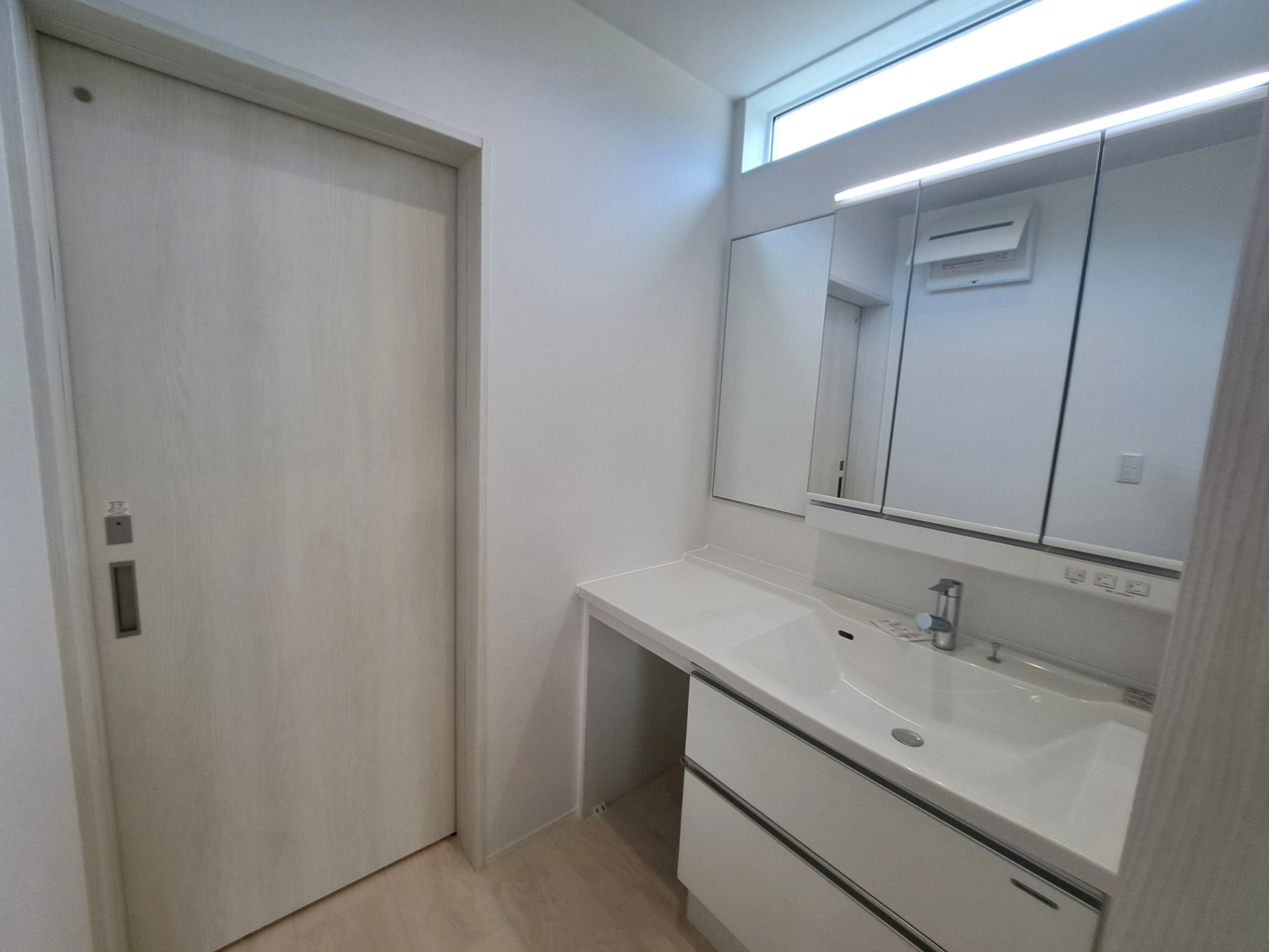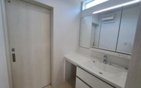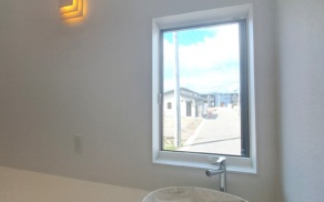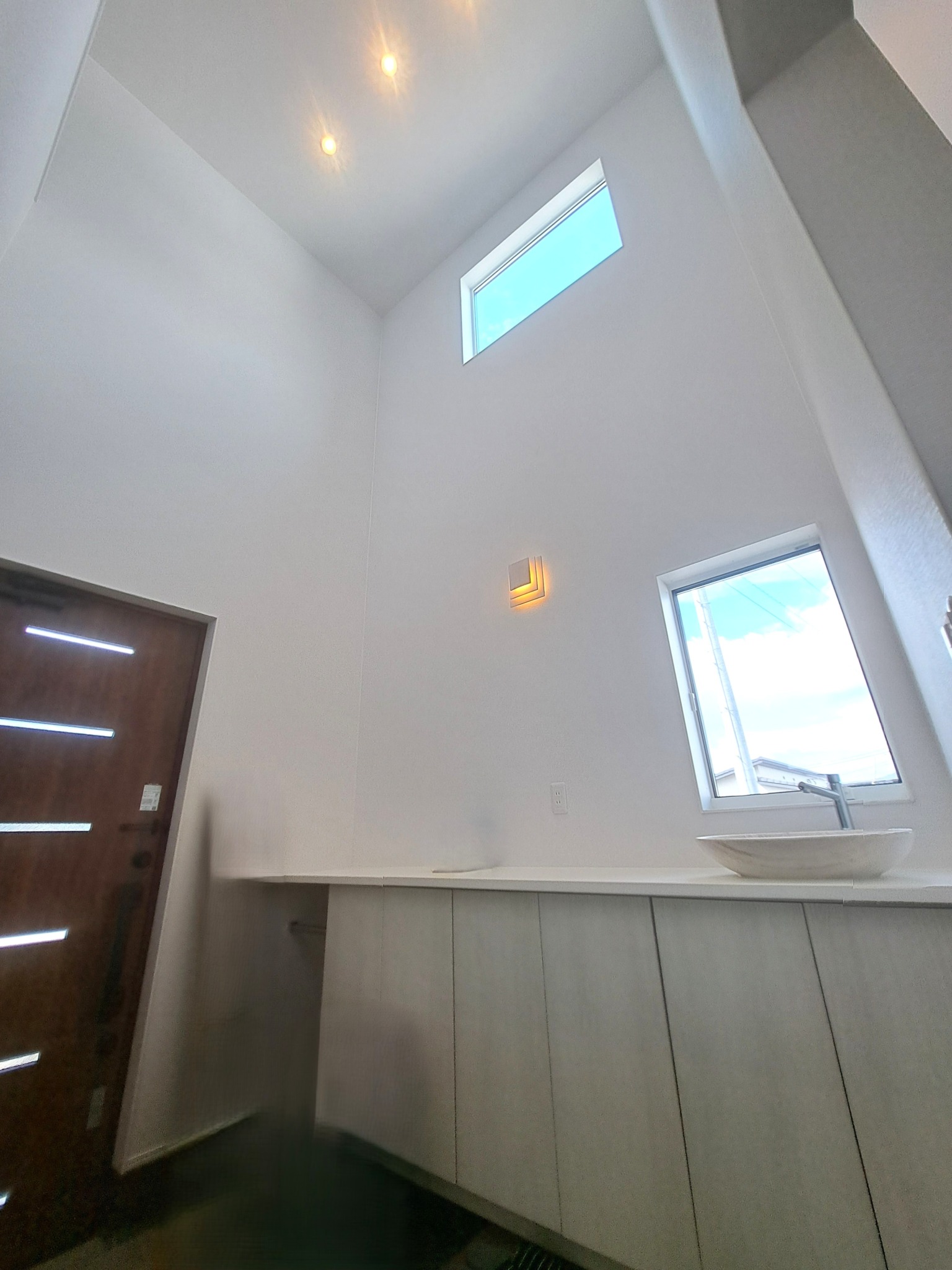 吹抜けになった玄関が圧倒的に広く明るく開放的なМ様邸。 腰高で並んだ下駄箱の上にはオシャレな手洗い器があり、 天井が高くなることで実際の広さ以上のゆとりを感じられるのも大きな魅力です。