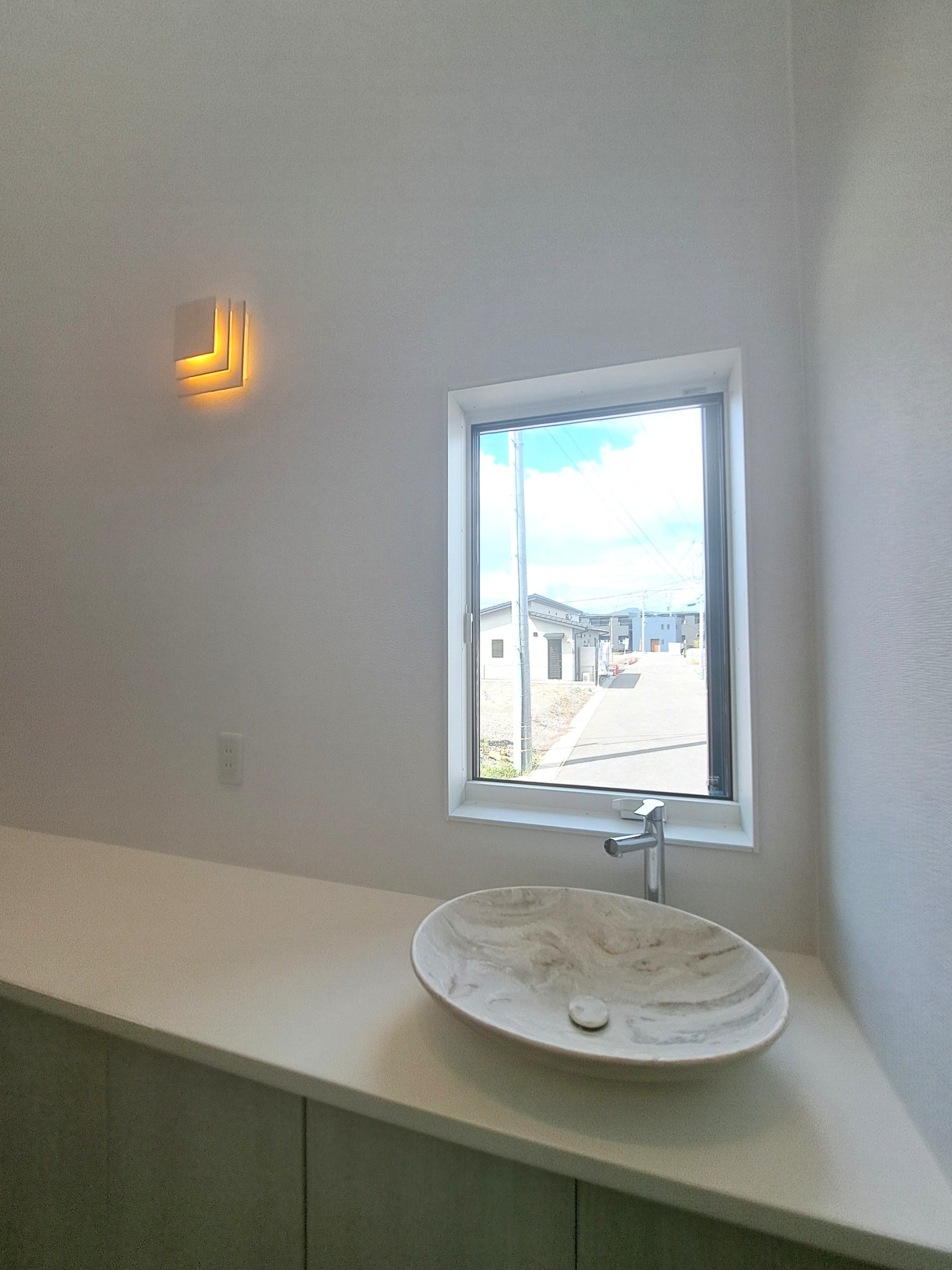 腰高で並んだ下駄箱の上にはオシャレな手洗い器があり、