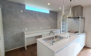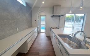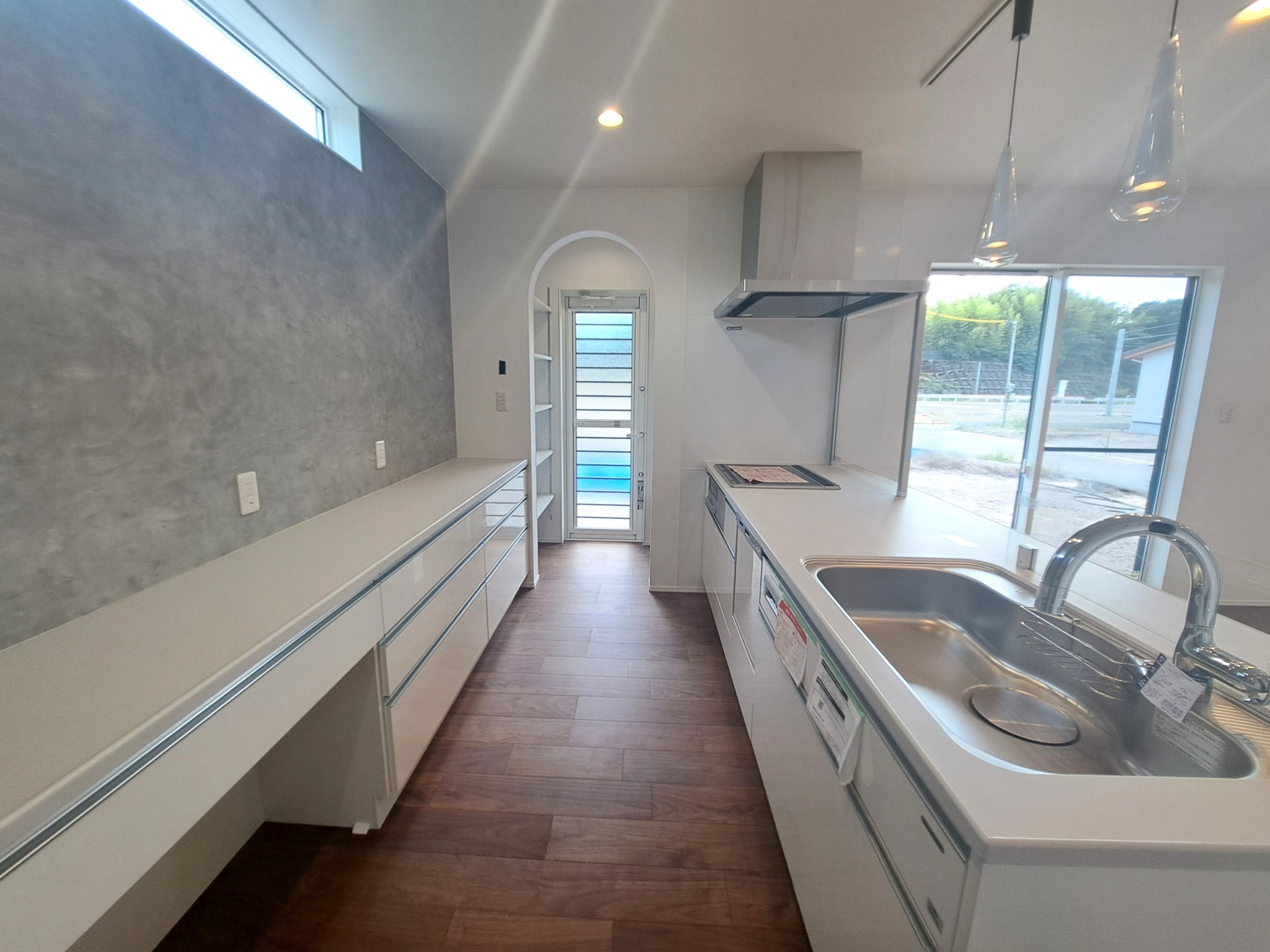 真っ白なフルフラットキッチンは見た目もおしゃれ。 背面収納もたっぷり付いて、奥にはパントリーと勝手口があります。