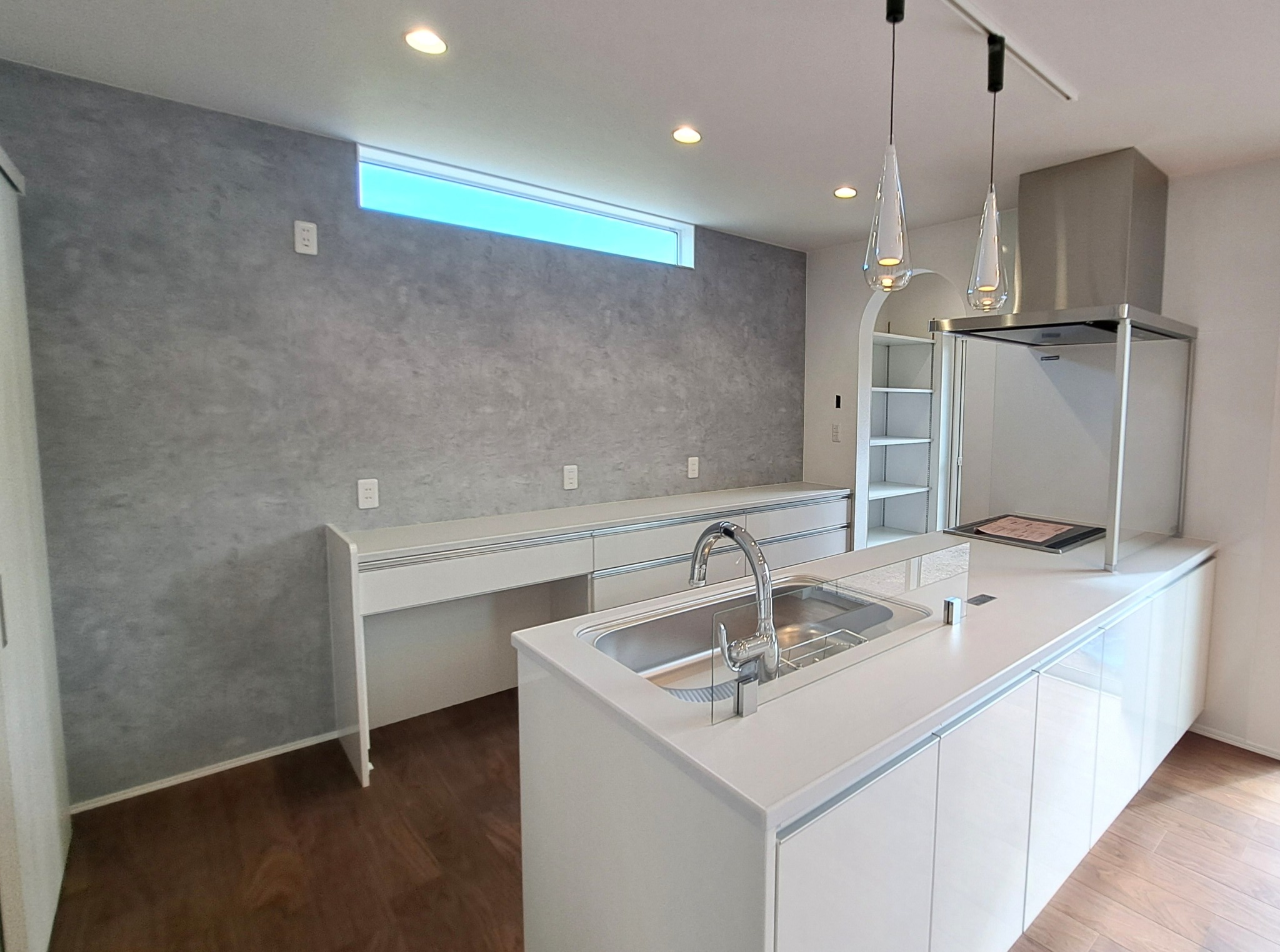真っ白なフルフラットキッチンは見た目もおしゃれ。