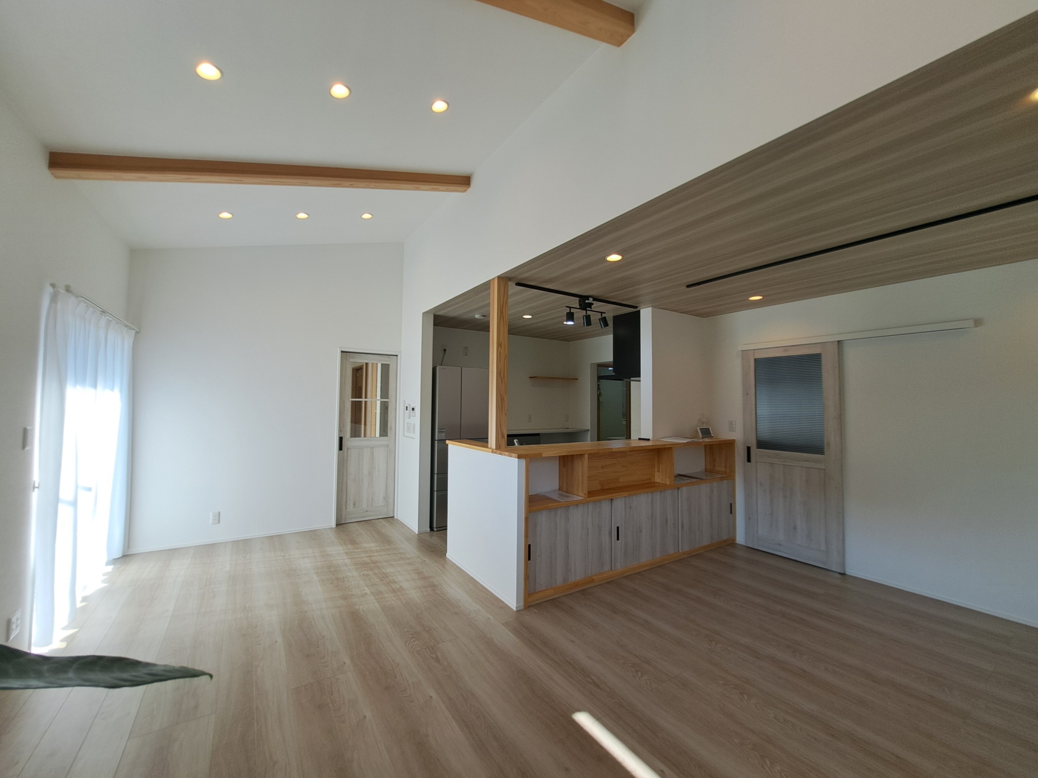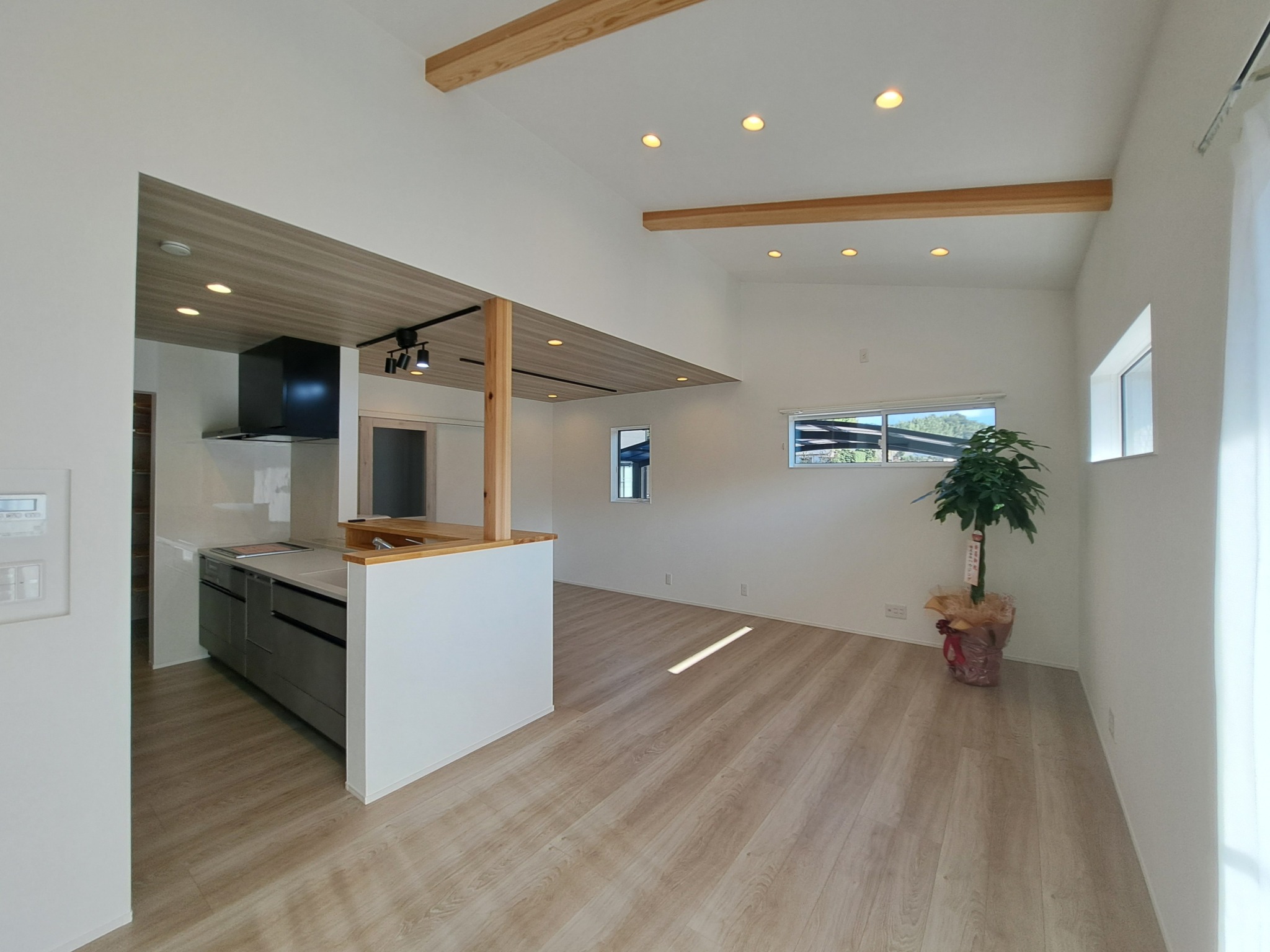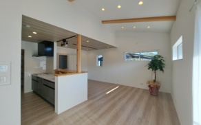リビングの勾配天井が心地よい開放感を生み出すO様邸。 天井に配した2本の化粧登り梁が空間に奥行を与え、 木の温もりをさりげなく感じられます。