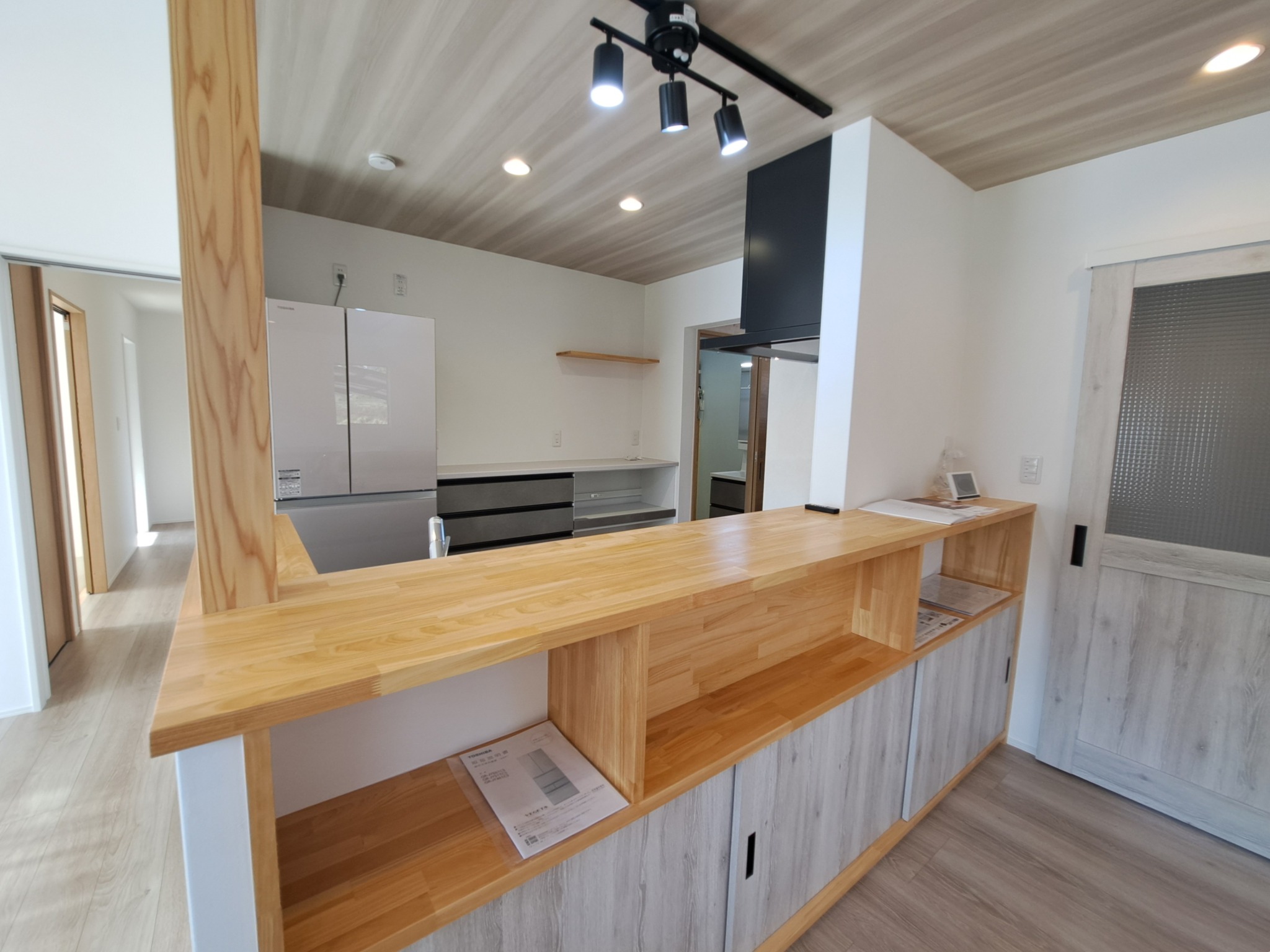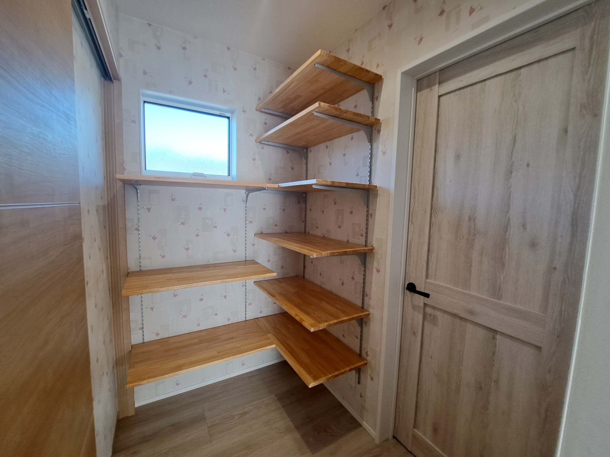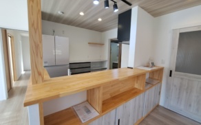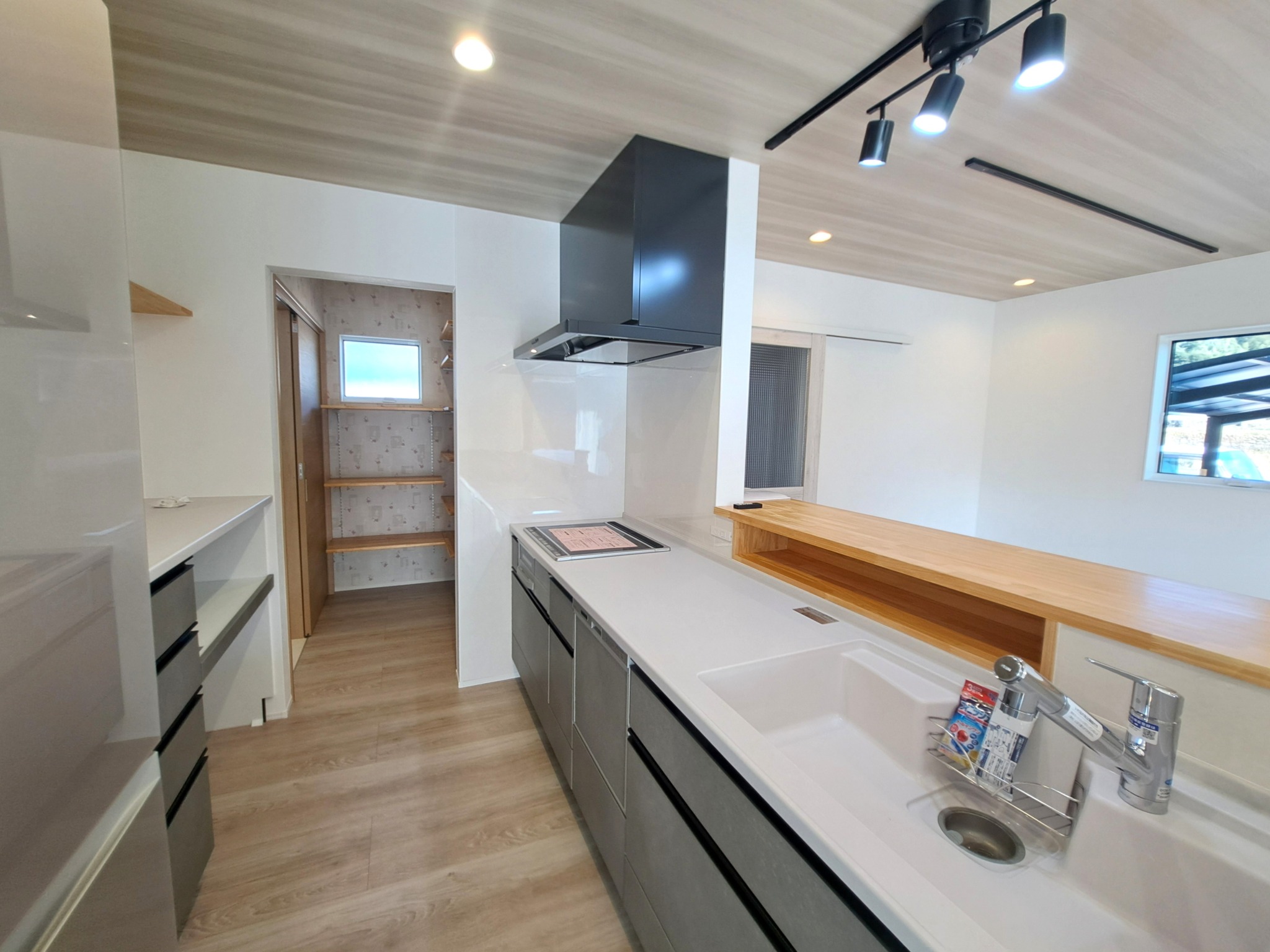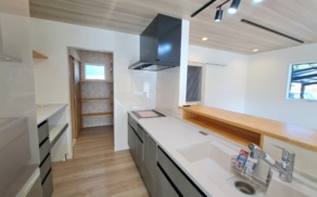 I型キッチンの向こう側は造作の収納スペースになっていて、